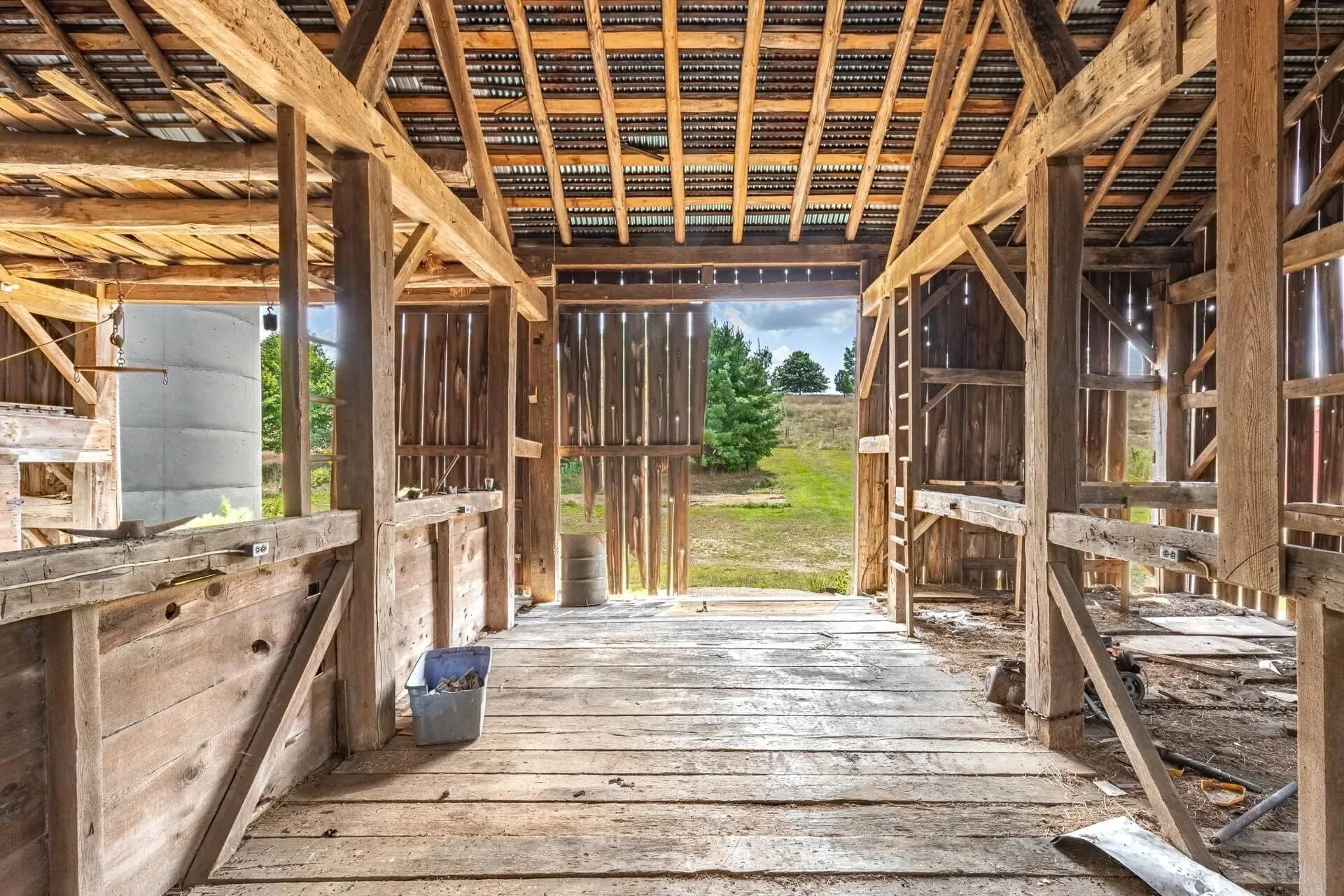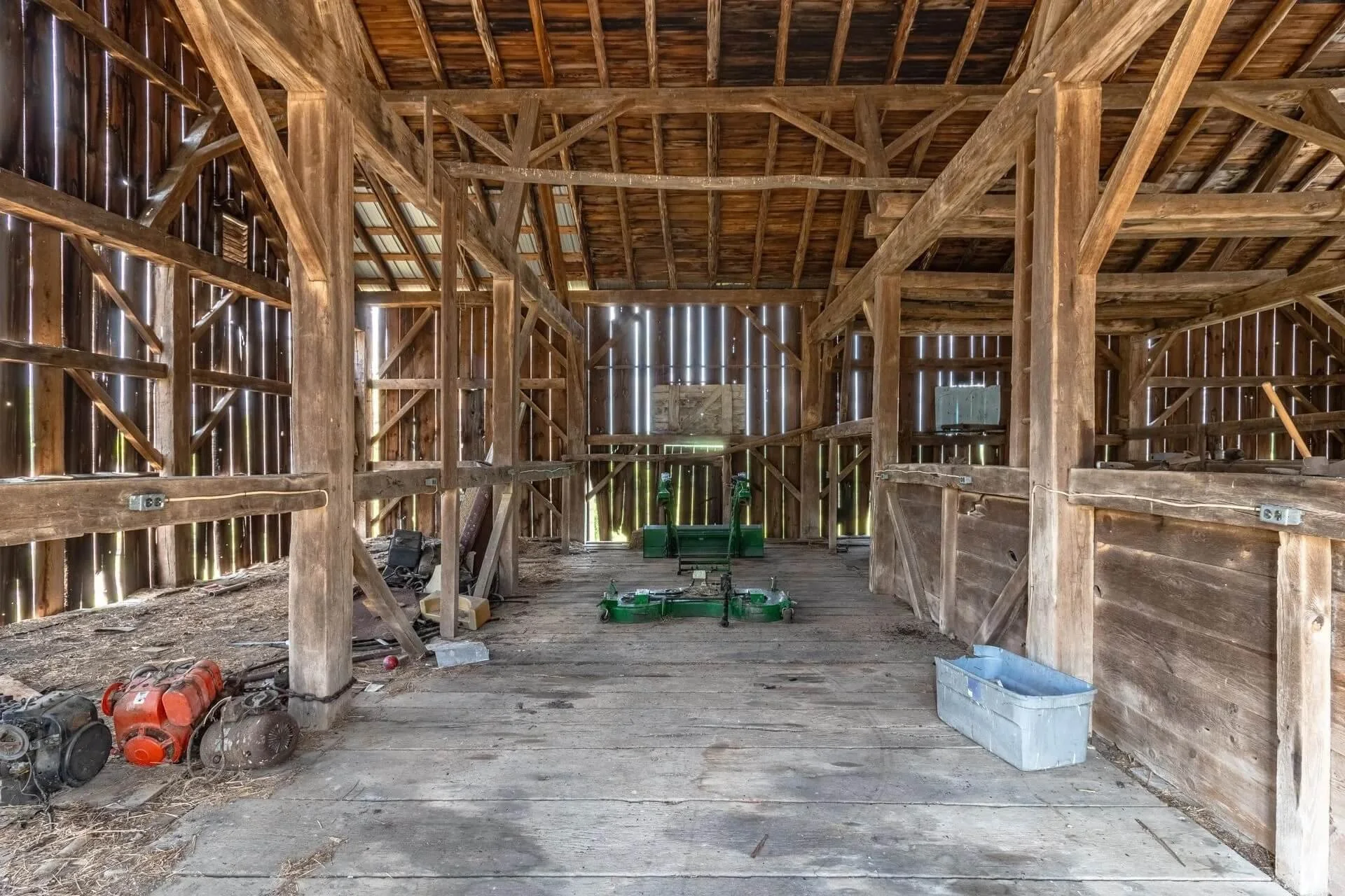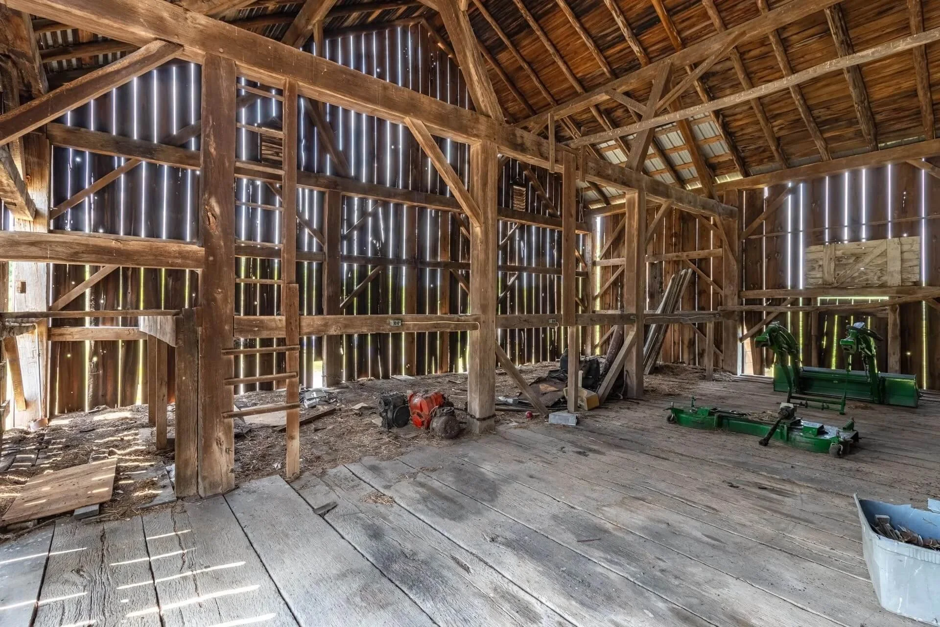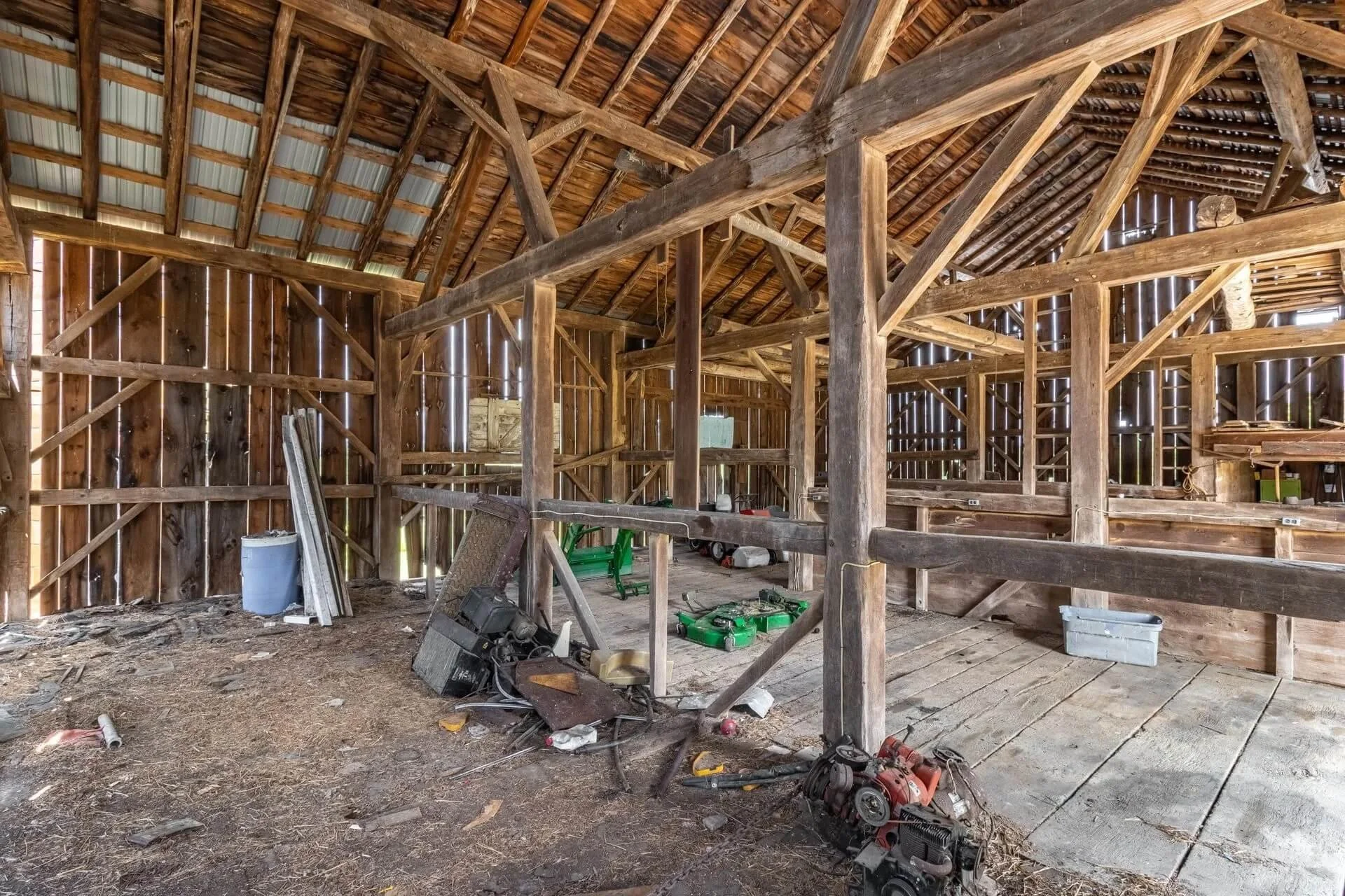The barn's frame is made of hand-hewn timber meticulously joined to form a structure of undeniable strength and character. Its 5/4/variable bent/bay spacing reveals a design optimized for functionality and durability. While currently a single-story building, the barn's soaring roofline hints at the potential for a transformative loft conversion.